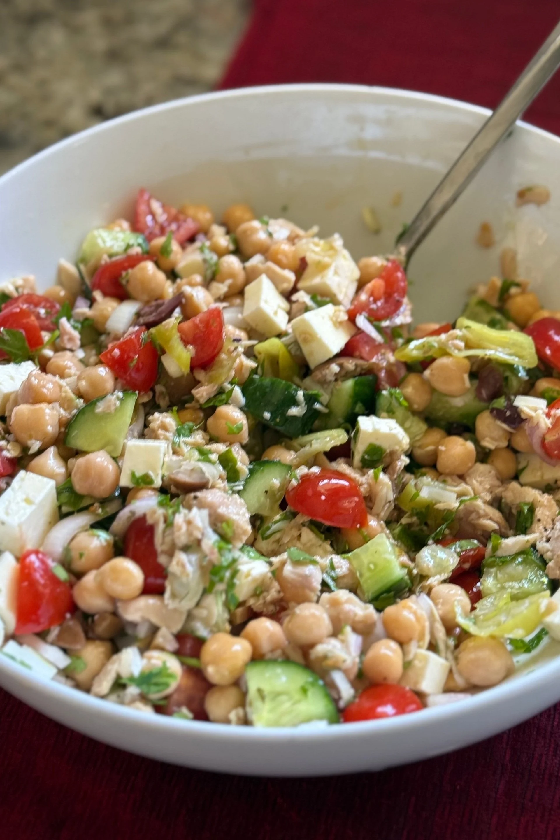Speaking of Instagram inspo, I saw this reel on no-lettuce salads and gave it a try. This was a can of tuna, a can of garbanzos, and basically the contents of a Greek salad. Split into 2 servings I got my 30 grams of protein plus some fiber without heating up the kitchen.